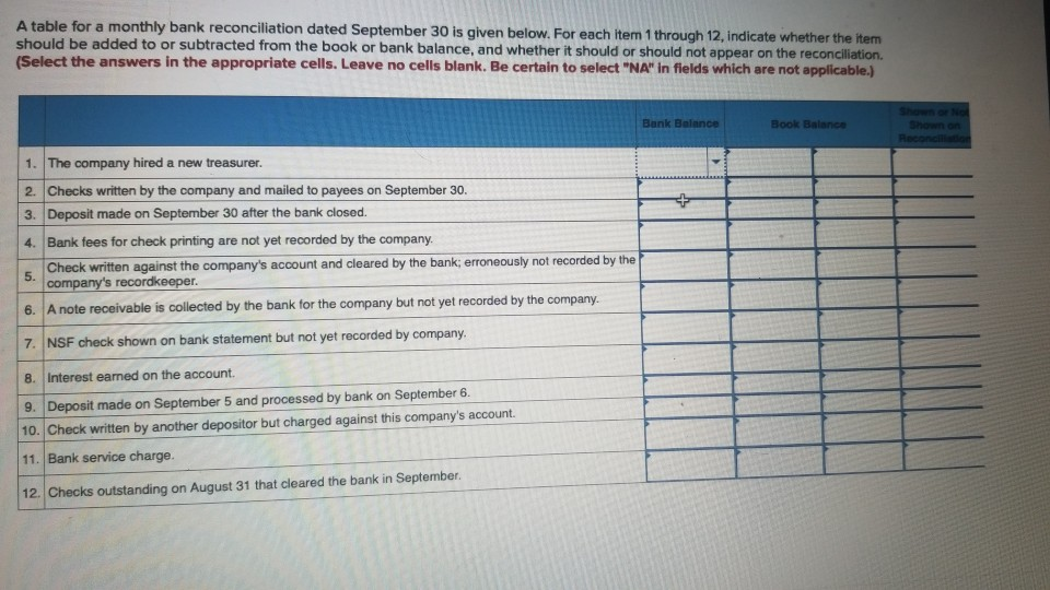 This statement is used by auditors to perform the companys year-end auditing. Leave no cells blank. A table for a monthly bank reconciliation dated September 30 is given below. Leave no cells blank. For each item 1 through 12 indicate whether the item should be added to or subtracted from the book or bank balance and whether it should or should not appear on the reconciliation. For each item through 12 indicate whether the item should be added to or subtracted from the book or bank balance and whether it should or should not appear on the reconciliation Select the answers in.